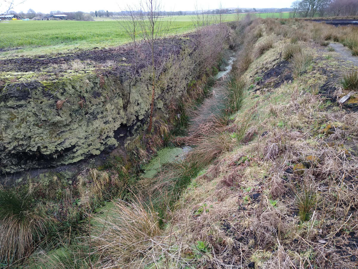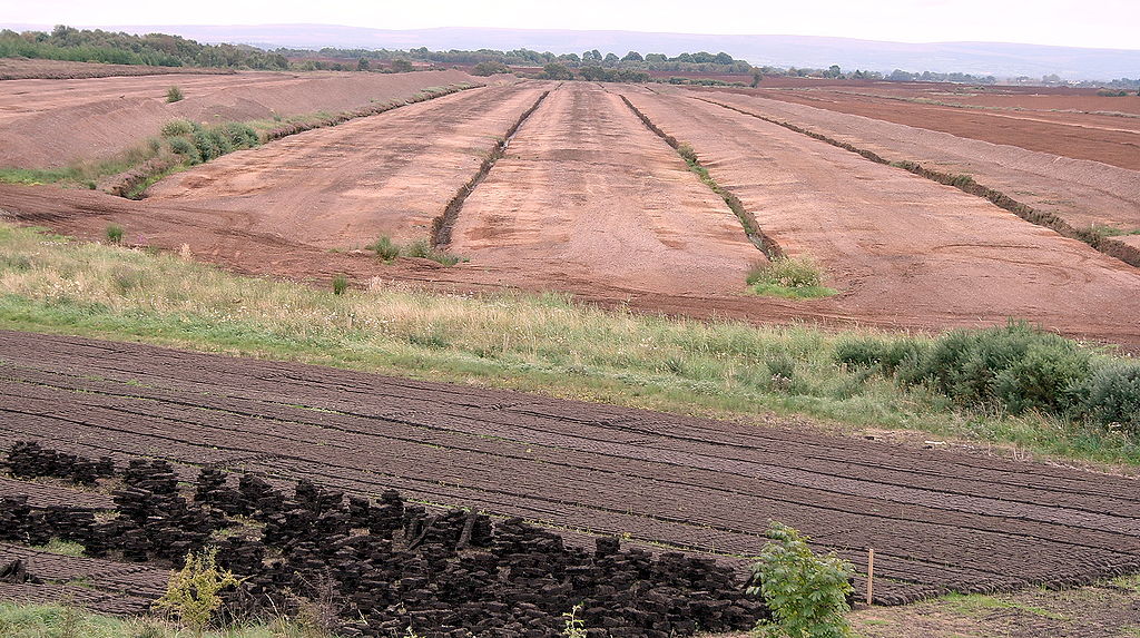 Commercial peat extraction for horticulture and energy is currently taking place on a far greater scale and is far more damaging. Peat accumulates at ‘2mm a year’ and ‘a hundred times that depth’ is removed each year by modern extraction methods such as peat milling. This begins with the drainage of the land by ‘regularly spaced deep drains’. Once the upper peat has dried ‘the surface vegetation is removed’ to create ‘bare black fields’ then the top layers are ‘rotovated’ or ‘milled’ to allow further drying before the peat is ‘bulldozed into long ridges’ then bagged or taken to power stations.