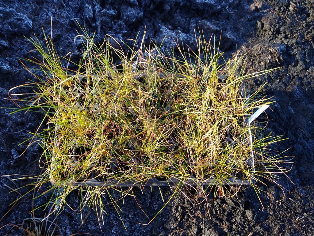 Sphagnum mosses can then be planted amongst the common cottongrass to form new hummocks and once these have formed species such as cross-leaved heath and bog rosemary can be planted on them.