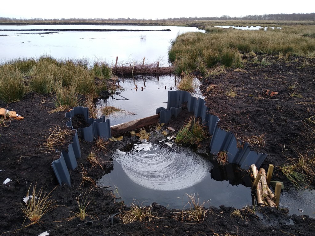 Peat bogs can be revived by blocking drains and building dams and bunds to prevent water loss and begin the long process of silting up with vegetation that will lead to the development of sphagnum.
