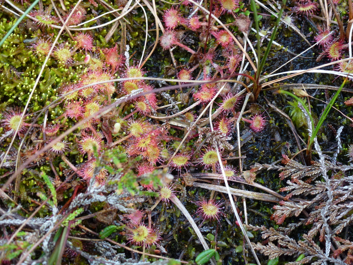 Sphagnum are the dominant species of mosslands and our lowland raised bogs include species such as S. magellanicum, S. papillosum, S. capillifolium, S. tenellum, and S. cuspidatum. Other plants that can survive in these conditions include common cottongrass (Eriophorum angustifolium), hare’s-tail cotton-grass (Eriophorum vaginatum), cross-leaved heath (Erica tetralix), bog rosemary (Andromeda polifolia), and round-leaved sundew (Drosera rotundifolia). Sundews are carnivorous bog plants ‘which gain extra nutrients (particularly nitrogen) by catching and absorbing insects.