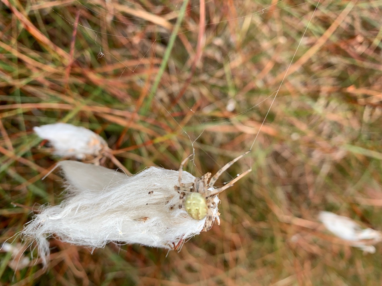 Fast-forward to August and, now a trainee, I am gathering cottongrass seed for the purpose of growing cottongrass sustainably at Prince’s Park Garden Centre. As I work I am aware that I am surrounded by webs and that in almost all of the cottongrass heads is a spider! Many of them are big, four-spotted, and vary in colour from orange to brown to green. They’re spooky and beautiful. I have to remove them from my clothes and tip them out of my bag at the end. Still, some end up coming home. I later learn they are Four-spotted Orb-weavers (Adraneus quadratus) and the cottongrass heads are their retreats.
