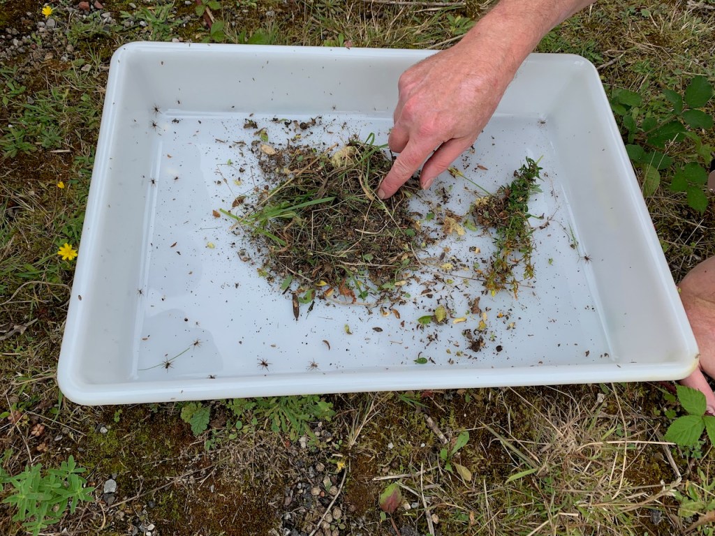 These encounters with spiders lead me to attend a workshop on identifying spiders in the field with Richard Burkmar, at Rixton Clay Pits, which is just down the road from Little Woolden Moss. I learn that, of the 650 species of spider in Britain, it is possible to identify around 200 with a hand lens or with the naked eye. Richard introduces us to collection techniques such as vacuum sampling, sweep netting, beating, and grubbing, and shows us how to catch the spiders in a spi-pot to examine them more closely.