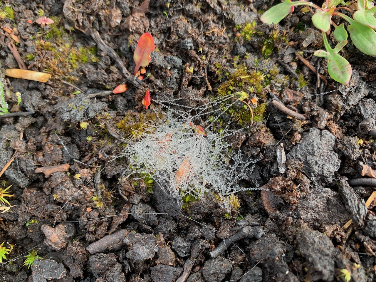 Recently fear has turned to fascination as I’ve started noticing them more and learning about them. This began in February when I was out planting with the Lancashire Wildlife Trust contract team on Little Woolden Moss. In areas of bare peat I frequently noticed strings and sometimes a lattice-work of spider-silk. On the last day the air was filled with threads and with tiny ballooning spiders. Like the carriers of a message.