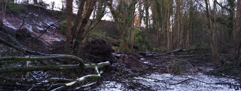 Following the intuition that the place was safe now and my gods wanted me to see what had happened I slipped past. Usually the council will fence things off at the tiniest reason. This was not small. It was catastrophic. A whole swathe of land had slipped away from the side of Church Avenue, which runs along Castle Hill – a pen ‘prominent headland’ – shaped a bit like Pendle. It had piled up on Fairy Lane with the debris of huge ivy-clad trees in their prime, fallen root over crown.