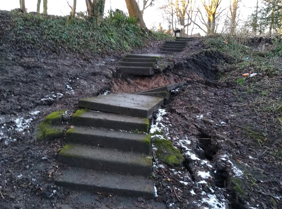 There are several reasons for the instability of the land. When the river Ribble was moved five hundred yards south from her original course to run beside Castle Hill, the sandstone bedrock was shattered. The aquifer beneath the hill was broken, leading to the holy well at the hill’s foot drying up. The building of the adjacent by-pass and its vibrations are likely causing the damaged land to slip.