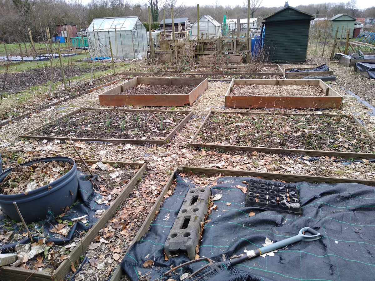 Since I took this photograph I have been clearing the paths, weeding, digging and putting manure on the beds, and chitting my first early potatoes.