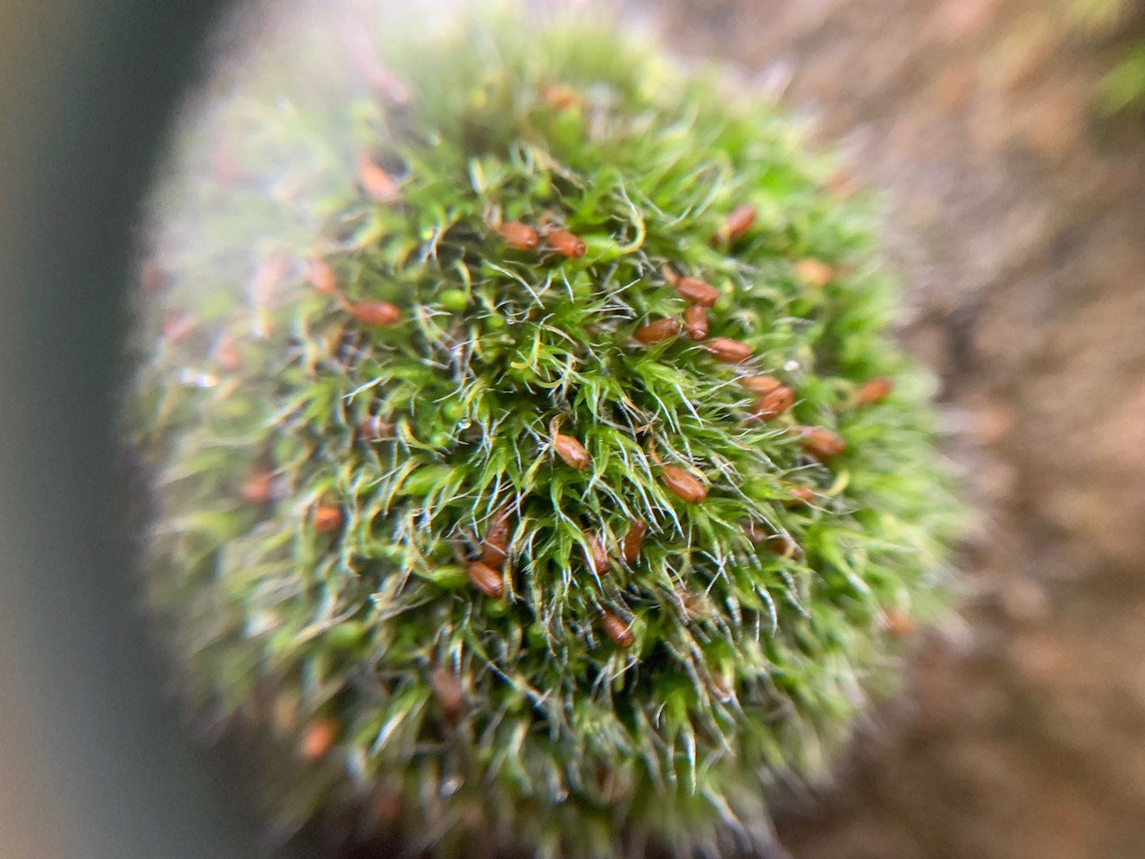On the wall on Church Avenue and on the old stone cross halfway down was the evocatively named Grey-cushioned grimmia (Grimmia pulvinata). It is named after a German scientist called Johann Friedrich Carl Grimm yet, to me, the name ‘grimmia’ is particularly evocative of this unmistakable mossy creature. By this point I had started getting to grips with taking photos through my hand lens.