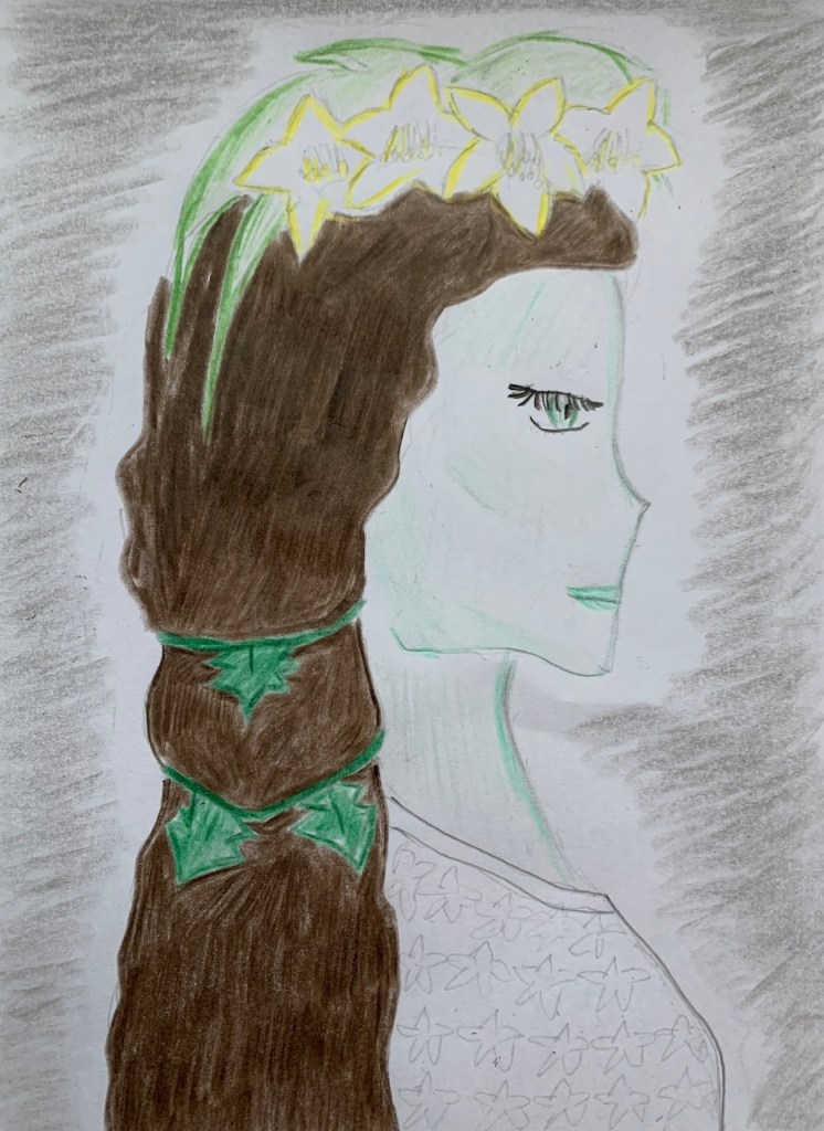 And I still live here in my mother’s house with all my flowers and earthly greenery twining my head and limbs and choose to go with my otherworld husband when his hounds call and the trees beg to leave their leaves.