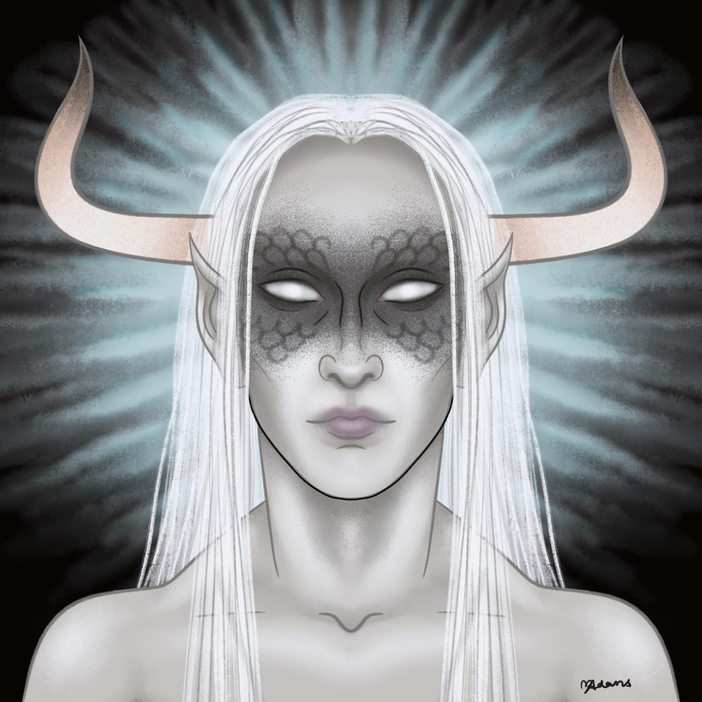 A couple of weeks ago I was delighted and honoured to receive this stunning piece of devotional art inspired by my representation of Gwyn in my King of Annwn Cycle books from one of my patrons, Morgannah. The dragon-scale shading around His eyes and the jewel in His forehead are based on my story about Him being born from the Dragon Mother, Anrhuna, His brief transformation into a black dragon when He eats His mother’s heart and His early days as ‘the Boy in the Serpent Skins’.