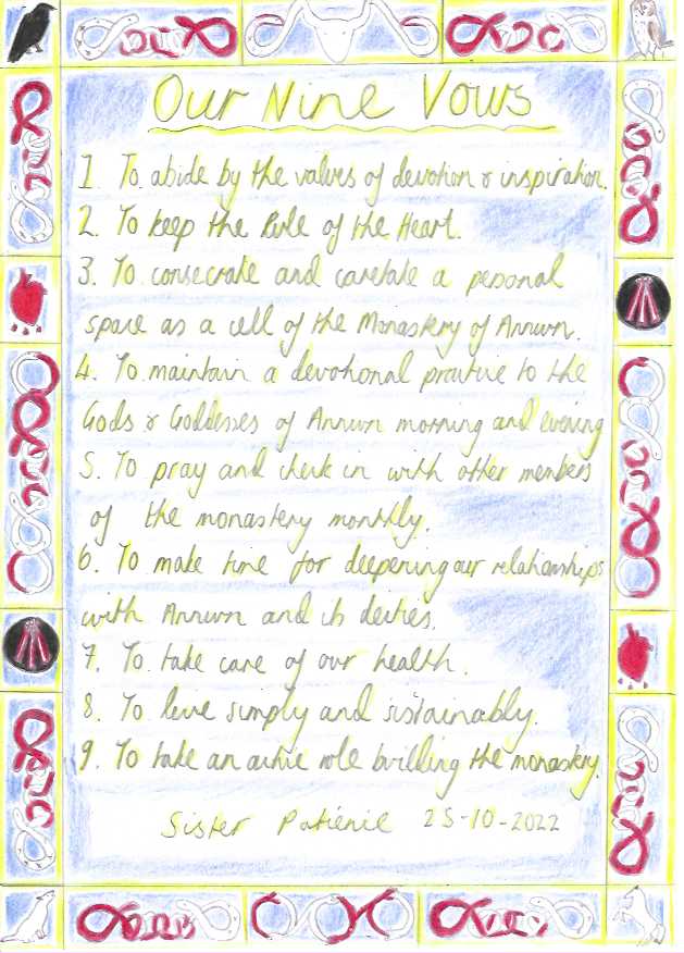We are bound as a monastery by our Nine Vows and the Rule of the Heart, along with daily and monthly prayers (many of which have been co-written and include a new moon prayer and a novena practice over the full moon) and our ritual year based around the mythos of our patron God, Gwyn ap Nudd.