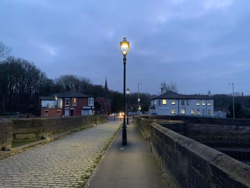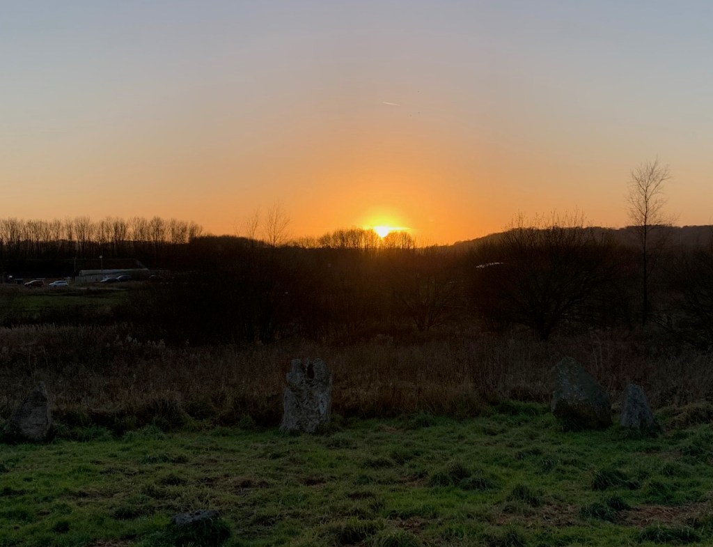 The photographs are of the sun beginning to set over the winter solstice stone at the stone circle at Brockholes Nature Reserve and over the visitor village and Meadow Lake.